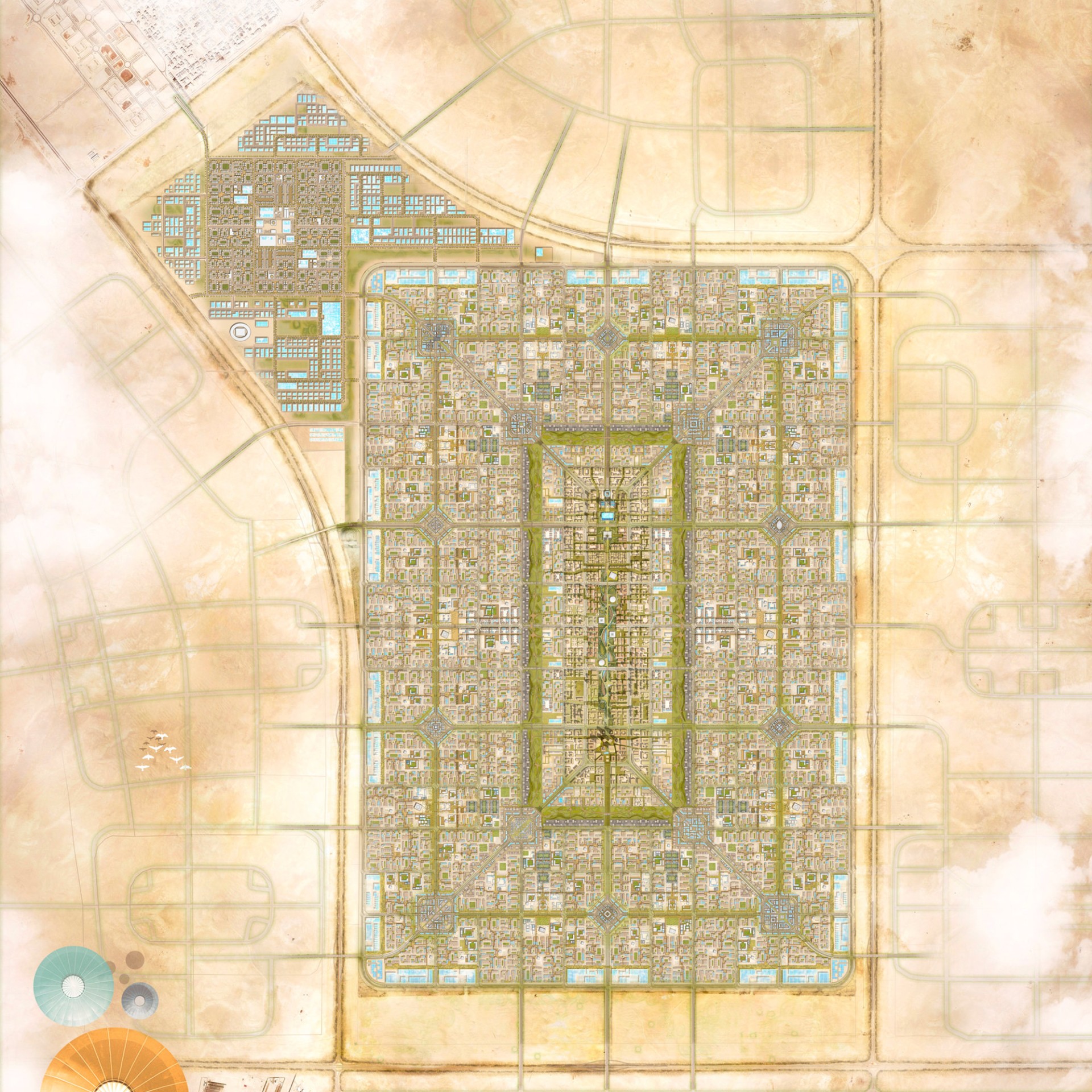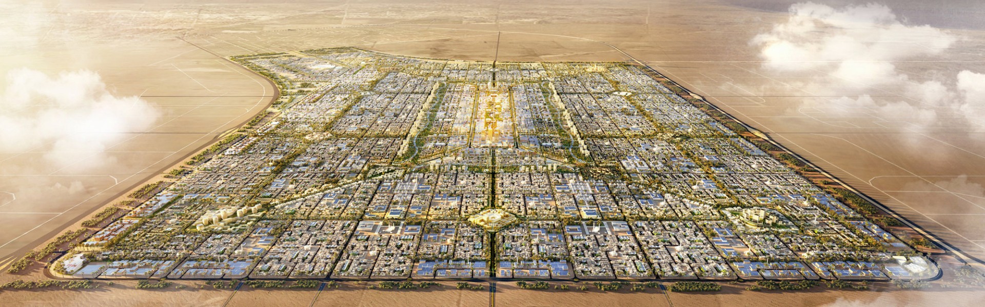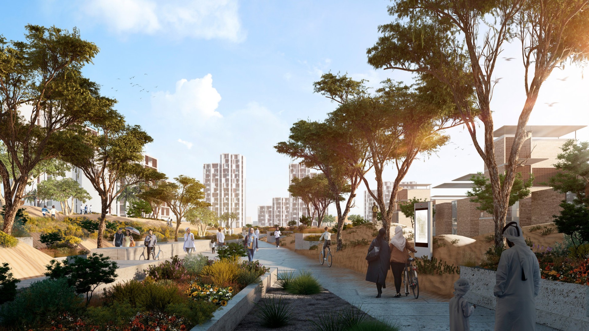 The 61.5 square-kilometre city is formed of ten neighbourhood clusters arranged around the city’s central business district, and bordered by a ring of light industrial buildings. The central district contains a sports stadium, museum, city university and a major city park, which forms the heart of the masterplan’s landscape strategy. Petal-like green spaces branch off from the city park, running between each of the neighbourhoods to create green urban links throughout the masterplan. The undulating topography of the development has been inspired by the gentle form of sand dunes in the desert.