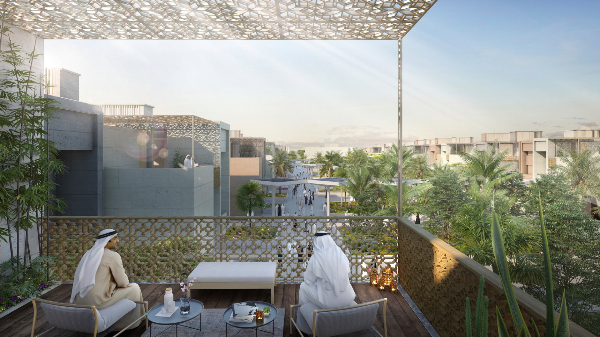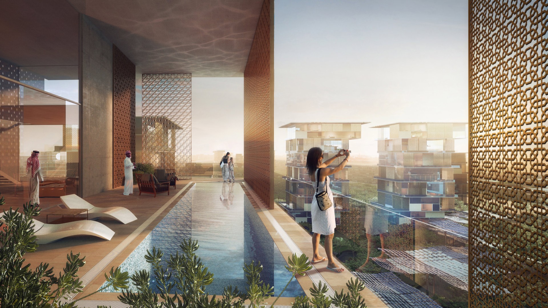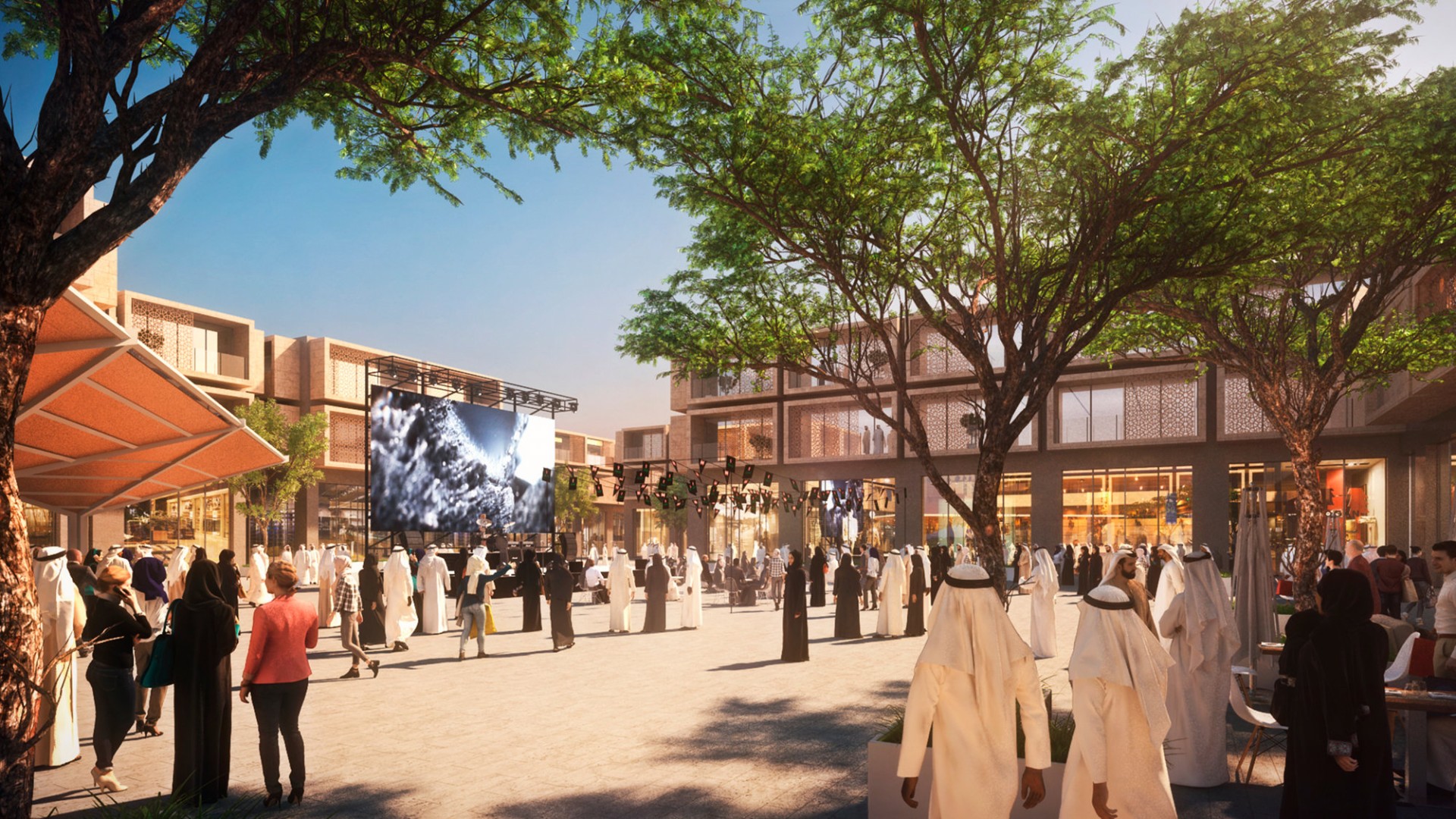 The masterplan offers a range housing typologies, including apartments and patio houses, encouraging high density living with equally high standards of luxury. The modular construction system adopted throughout allows for multiple configurations and ensures high quality buildings, while also contributing to strengthening the construction industry in Kuwait. The pilot neighbourhood cluster will also feature roof-top photovoltaic installations on the industrial buildings surrounding the development, to further strengthen the sustainable credentials of the project. The city also offers opportunities several leisure activities such as desert glamping, e-biking, design galleries and luxury shopping.